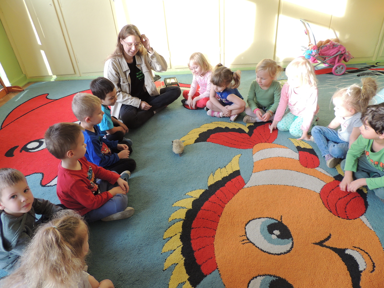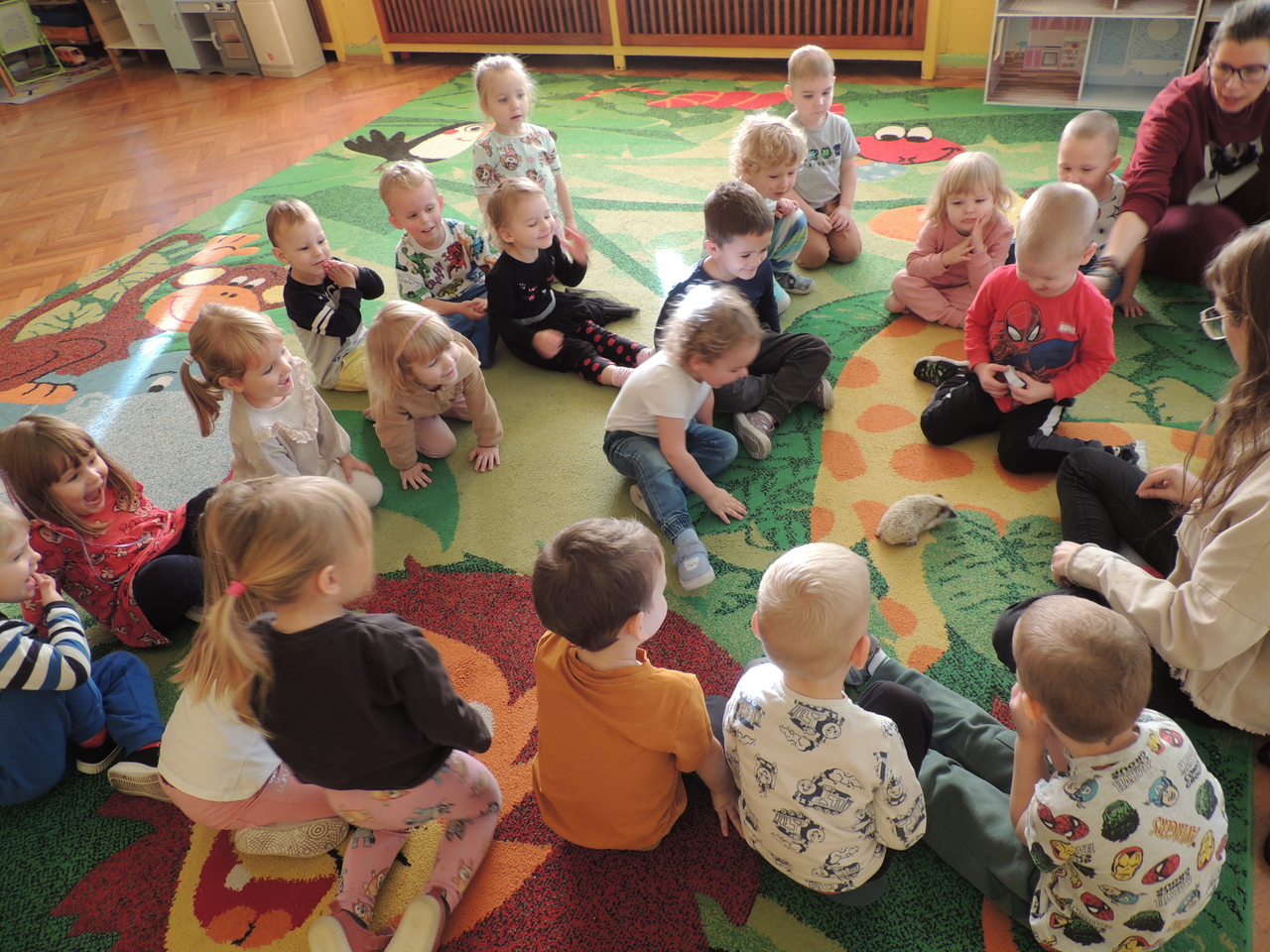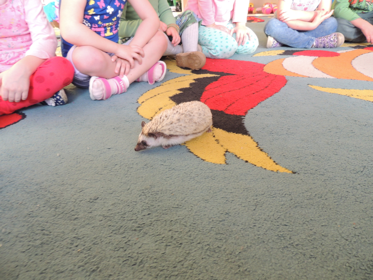 Czasami w naszym przedszkolu miewamy gości. Tym razem odwiedziły nas przemiłe zwierzaki - jeż pigmejski i lotopałanka. Słuchaliśmy z uwagą tego, co mówiła do nas pani, która się nimi opiekuje. Dowiedzieliśmy się bardzo wielu ciekawych wiadomości, a także mieliśmy okazję przyjrzeć się tym pięknym zwierzakom z bliska.